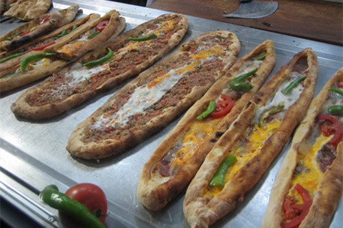 土耳其披萨通常是用船型的面饼做成的,口味丰富,其中肉末、菠菜和奶酪混合的口味最为常见。