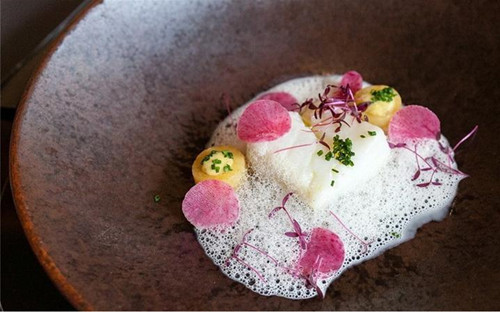 这道同样由 Akrame Benalla 创作的菜肴是用 竹炭 慢煮后的 鸡蛋 搭配熏烤过的 鳕鱼 而成,即简洁大