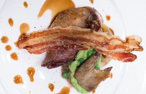 大蒜炖烤乳鸽胸肉,法式青豆煨鸭肝,这是巴黎 Thierry Dufroux 的作品。他所在的餐厅坐落在因风