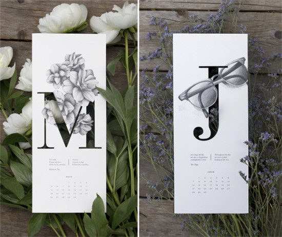这或许是最具诗意的年历了,每个月份的首字母镂空,配上与之相关的事物,和以12句传统的日本俳句