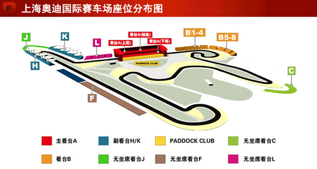 L看台:面对维修区入口,可看到赛车转出最后一个弯角全速冲线的精彩场面。更可看到部分颁奖盛况。