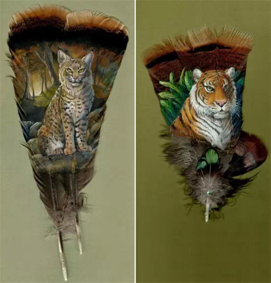 如果你觉得在 羽毛上画画 是件很难的事,那你得来看看下面这个天赋异禀的艺术家的作品。来自康乃狄克州 的 Brenda Lyons以火鸡羽毛为画布,画出了许多栩栩如生的动物,这一系列作品被命名为“‘Painted Feathers”。
